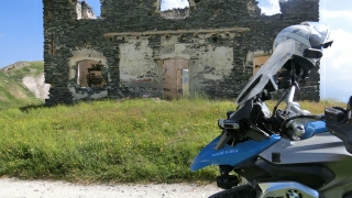 Na een lekkere lunch op de top van de verharde Col Sampeyre op 2284 meter hoogte, vervolgen we de route met 25 km onverharde weg over de Maira-Stura bergkam. Deze route gaat voor een groot deel strak langs steile rotswanden met direct daarnaast diepe ravijnen. De weg is echter perfect te berijden en de uitzichten zijn werkelijk adembenemend mooi. Na elke scherpe bocht kijken we weer in een andere vallei: Prachtig! Op het einde van de route komen we bij een voormalig militair stadje waar tientallen vervallen militairen barakken op instorten staan. Er is helemaal niemand en alle deuren en ramen zijn in de loop der jaren vergaan, waardoor het een echt spookstadje is geworden. Als we s tapvoets door de volledig verlaten straten rijden, ontdekken we een oude militaire begraafplaats met honderden graven. We stoppen even en beseffen wederom dat we zeker in deze onrustige tijden dankbaar mogen zijn dat de Europese oorlogen verleden tijd zijn. Zoals de Engelse zo mooi zeggen: "United we are strong".