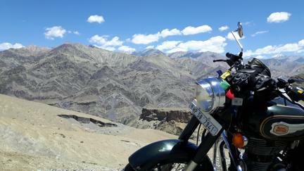 Grote hulp voor de militairen was zonder twijfel de Royal Enfield WD/RE oftewel the "Flying Flea". Een doorontwikkeling van de RE 125cc versie die voor het Nederlandse bedrijf Stokvis en zonen al in 1938 was ontwikkeld. Deze WD/RE Enfield woog slechts 59 kg, kon aan een parachute gedropt worden, en was uitermate geschikt voor het ruige bergachtig terrein van de Himalaya. Leuk detail is dat deze fiets ook tijdens D-day door de 6e Airborne brigade in Normandië volop werdt gebruikt.Vandaag beklimming we de hoogst berijdbare bergpas van de wereld, de Khardung La, met maar liefst een hoogte van 5602 meter. Het eerste deel tot de permit controle is keurig nieuw asfalt, maar daarna is het weer de bekende gatenkaas met regelmatig losse rotsblokken en grind. Men is wel volop bezig met wegwerkzaamheden, maar dat is letterlijk handarbeid. Tientallen Indiërs zitten in de volle zon gehurkt met kleine hamers één voor één grote rotsblokken kapot te slaan naar grind formaat. Met deze werkwijze is men nog jaren bezig voordat ze voldoende grind hebben, maar dat is misschien ook wel beter, zodat de charme van de onverharde Himalaya zo lang mogelijk blijft bestaan. In 2018 wordt er al een grote tunnel geopend bij de Rohtang pas, waardoor de oversteek al een stukje gemakkelijker zal worden. De echte originele oversteek zal waarschijnlijk alleen nog in 2017 gereden kunnen worden.