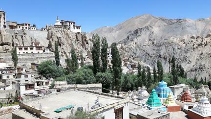 Bijna net zo kleurrijk zijn de slingers van de boeddhistische gebedsvlaggetjes. Blauw, wit, rood, groen en geel vormen een feestelijk hoogtepunt van elke hoge bergpas en elke boeddhistische tempel of klooster. Elke kleur staat voor een element in de natuur en de tekst op de vlaggetjes is vaak de bekende mantra "Om Mani Padme Hum". Vrij vertaald betekent deze tekst zoiets als: "Geluk is met U en iedereen in uw omgeving.". De vlaggetjes dienen zo hoog mogelijk opgehangen te worden, zodat de wind de mantra tekst zo ver mogelijk kan meenemen. Zodra de vlaggetjes vergaan zijn is de tekst overgedragen aan de ontvangers en is er weer een beetje meer geluk op deze aardbol. Ook het door ons bezochte Lamayuru klooster is behangen met duizenden vlaggetjes en de 150 permanente monniken prevelen dagelijks alle mogelijke mantras voor een perfecte wereld. Het Lamayuru klooster wordt door ons vooral bezocht vanwege de prachtige route door de Moonvalley. Aan de ene kant de machtige Indus rivier en aan de andere kant rotsen met wederom alle kleuren van de regenboog. Het is hier zo mooi dat de huidige Dalai Lama al heeft aangekondigd hier zijn laatste levensjaren te willen doorbrengen.Voor het hoogtepunt van onze reis overnachten we eerst in het stadje Leh, de hoofdstad van het voormalige koninkrijk Ladakh. Net zoals Manali is Leh het begin/eind punt van de grote Himalaya oversteek, dus plots zijn er weer volop winkeltjes en restaurants. We genieten van heerlijke croissantjes, echte cappuccino's en 's avonds een echte Italiaanse pizza. Deze stad is voor India ook altijd een belangrijke strategische plek geweest, met Pakistan en China op een steenworp afstand. In het vlakbij gelegen War Museum krijgen we een goede indruk van hoe de veldslagen hier hoog in de bergen in het verleden zijn uitgevoerd. Kou en hoogteziekte waren hierbij misschien wel de grootste vijanden.